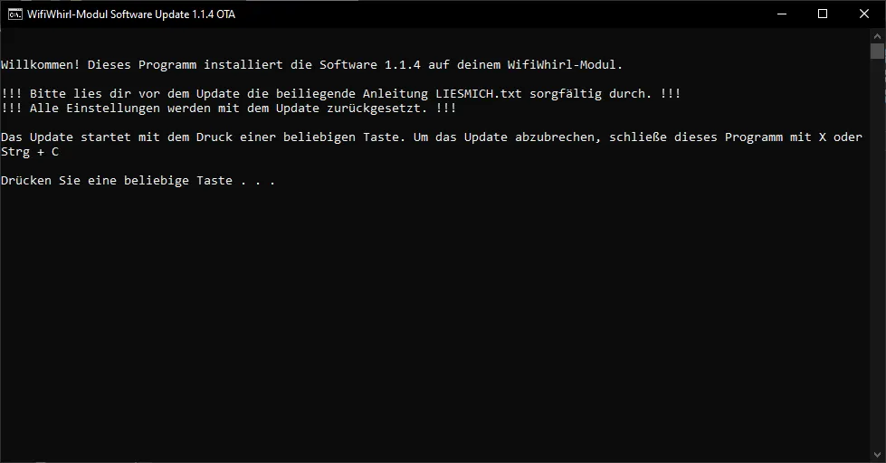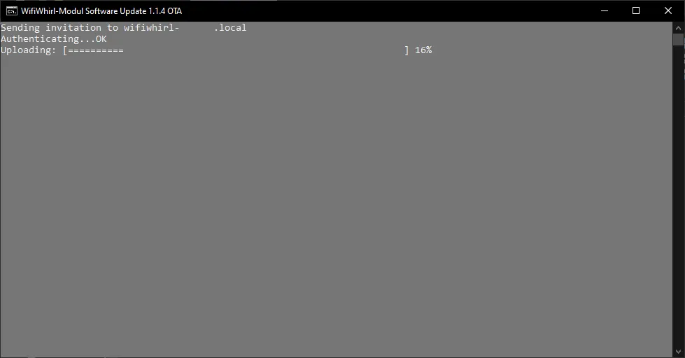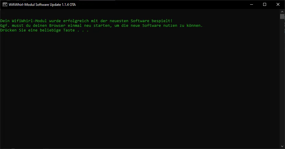 Nachdem dein WifiWhirl-Modul mit der Rescuesoftware bespielt wurde, wird es sich nicht automatisch wieder mit deinem WLAN verbinden. Verbinde dich daher erneut mit dem Konfigurationswlan deines WifiWhirl-Moduls (vgl. Bedienungsanleitung) und stelle die Verbindung mit deinem Heim-WLAN her. Sobald die Verbindung mit deinem WLAN hergestellt wurde, führe das Programm WINDOWS_flash_OTA.bat aus deinem Updatepaket aus.